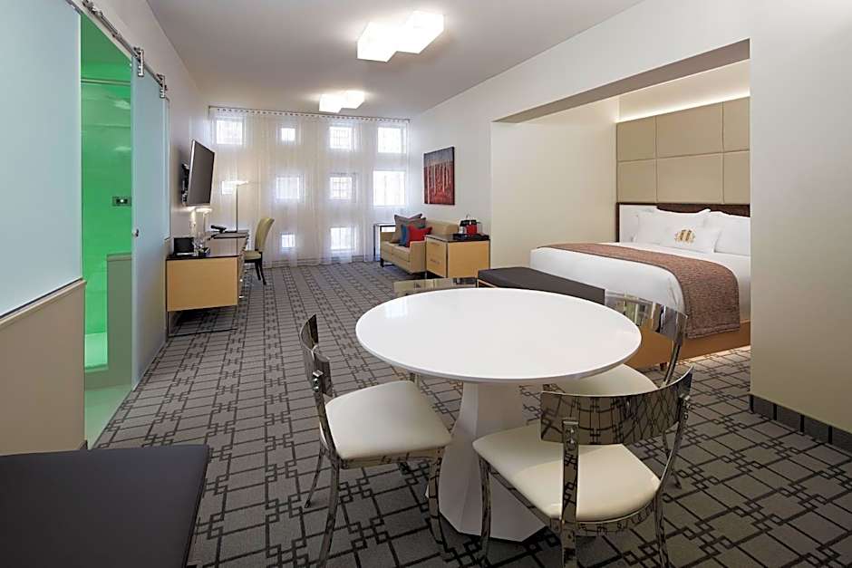 This split-level room with a private terrace overviewing downtown features a fireplace and climate/lighting/curtain auto controls. Also offers a light therapy rain forest shower head and a separate bath.
